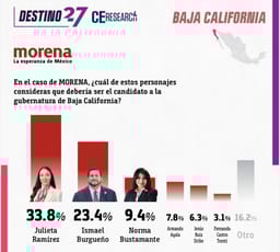 De acuerdo CE Research, Julieta Ramírez tiene el 33.8 por ciento de las preferencias, y el alcalde de Tijuana, Ismael Burgueño un 23.4. esta encuesta midió además los atributos de "candidato más honesto", "cercano a la gente", "mejor preparado", y "con mayor capacidad para gobernar". En ese sentido, en los tres primeros la senadora morenista superó a sus compañeros aspirantes por prácticamente 30 puntos.