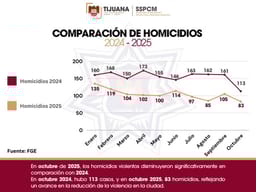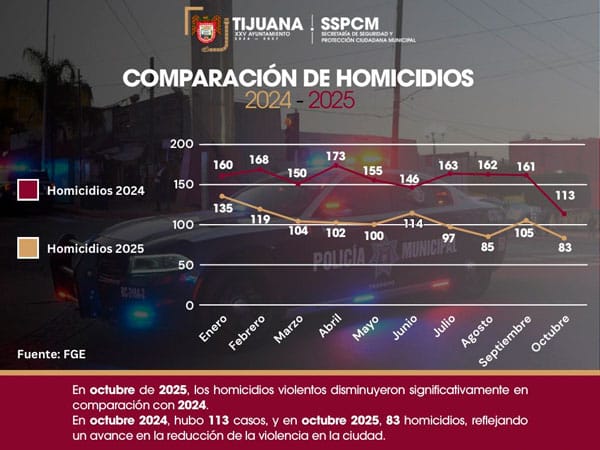 De acuerdo con registros preliminares, durante el mes de octubre del año en curso, se registraron 83 homicidios, 30 menos en el mismo periodo, pero del año 2024 esto como resultado de las acciones implementadas en materia de seguridad el alcalde Ismael Burgueño Ruiz. En el décimo mes del 2025, se han decomisado más de 71 armas de fuego, de las cuales 14 son largas y 17 armas de utilería.
