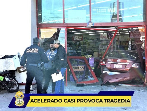 Joven de 19 años de edad de nombre Abdul Yadier conducía un auto a toda velocidad por el bulevar Lázaro Cárdenas a la altura de la Misión Dragón pierde el control y se va contra el local de la tienda Waldo’s, incrustándose por completo dentro del comercio, por fortuna no había muchas personas en el lugar, por lo que nadie resultó herido.